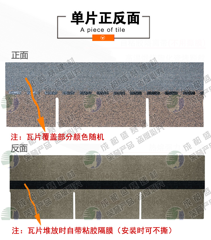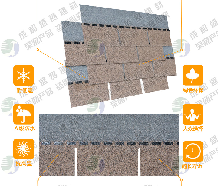 本款产品颜色丰富,立体感强,一般适用于广泛应用于高档别墅、高档小区、政府安置工程,学校工程等工程,产品可自由裁剪,能成功覆盖于不同形状和不同基层的屋顶。适用屋面坡度从15°到90°不同建筑。