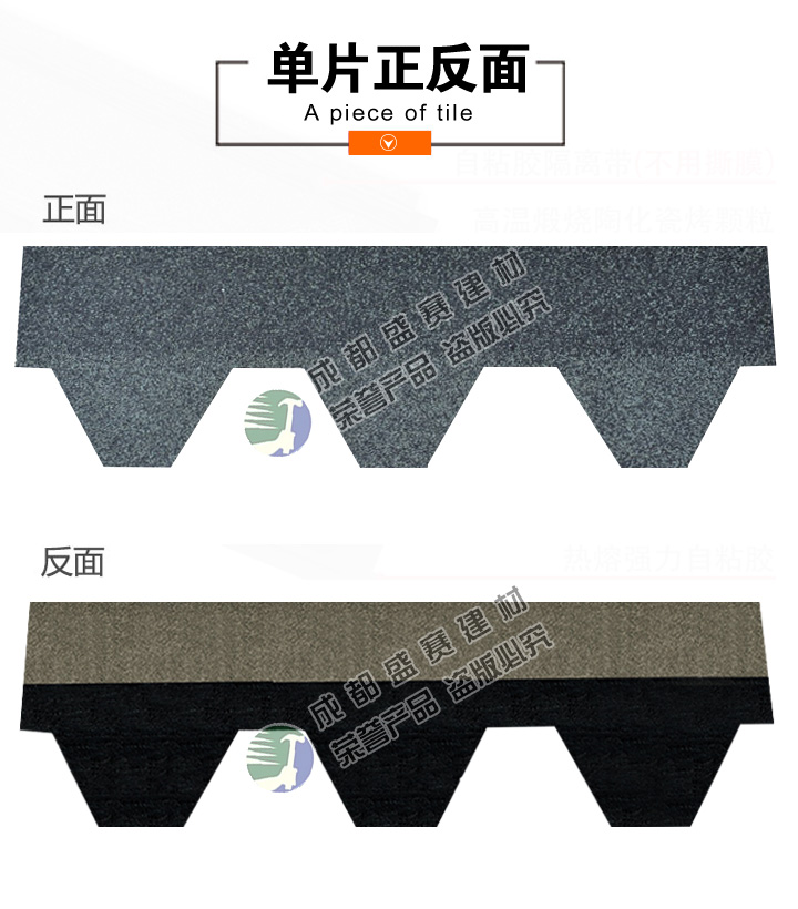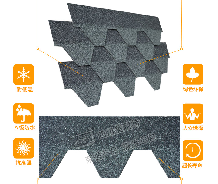本款产品颜色丰富,立体感强,一般适用于广泛应用于高档别墅、高档小区、政府安置工程,学校工程等工程,产品可自由裁剪,能成功覆盖于不同形状和不同基层的屋顶。适用屋面坡度从15°到90°不同建筑。