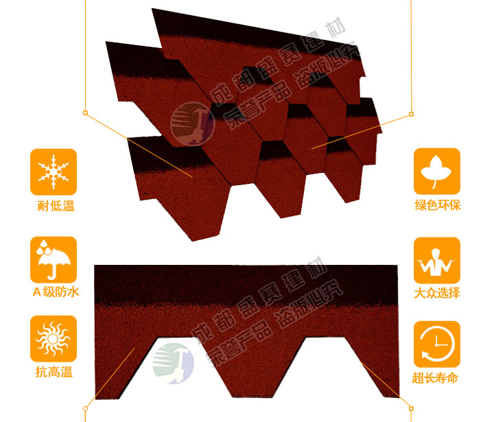 本款产品颜色丰富,立体感强,一般适用于广泛应用于高档别墅、高档小区、政府安置工程,学校工程等工程,产品可自由裁剪,能成功覆盖于不同形状和不同基层的屋顶。适用屋面坡度从15°到90°不同建筑。